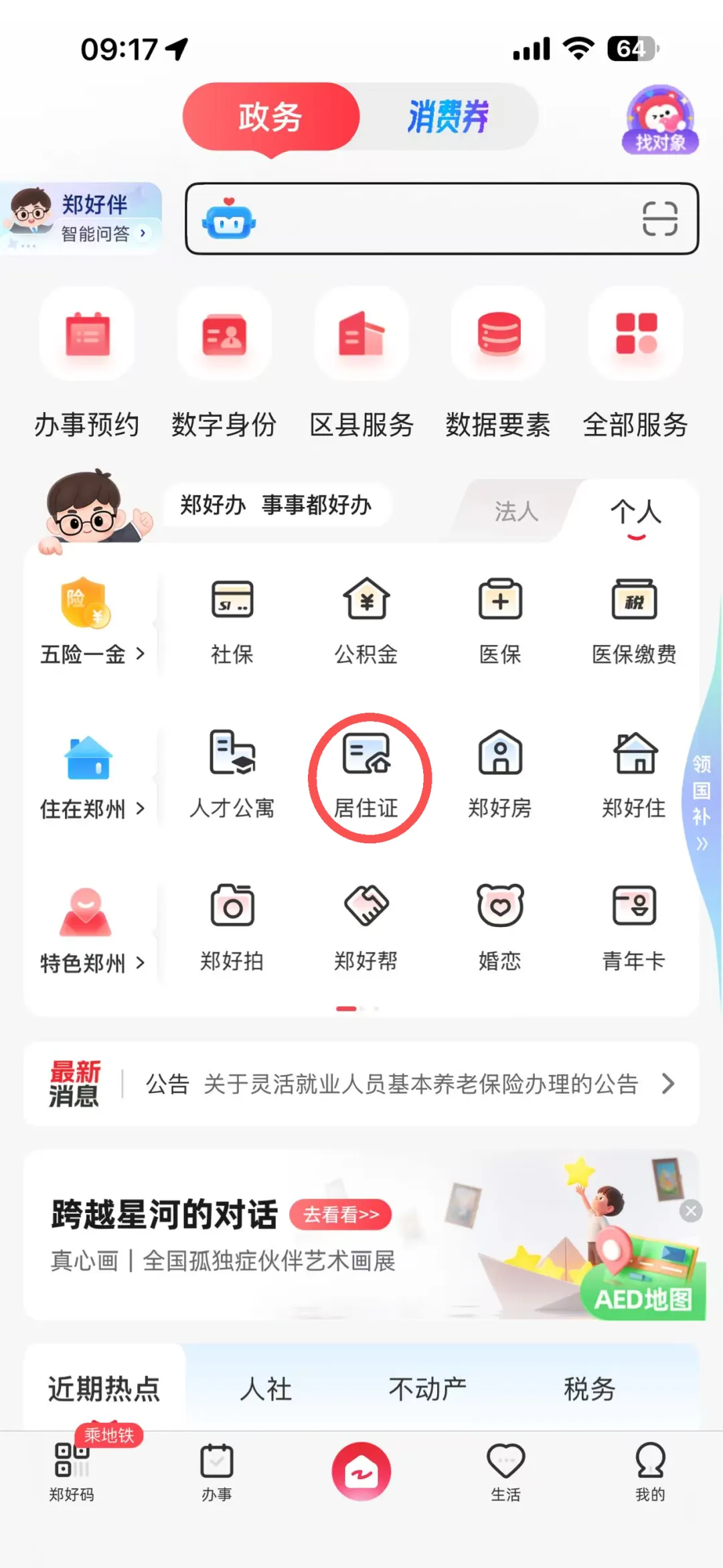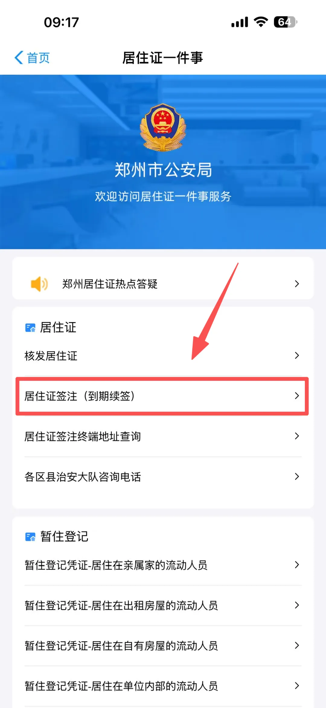 1️⃣进入郑好办APP,点击首页【居住证】或者搜索【居住证】进入居住证一件事页面,点击【居住证到期签注】