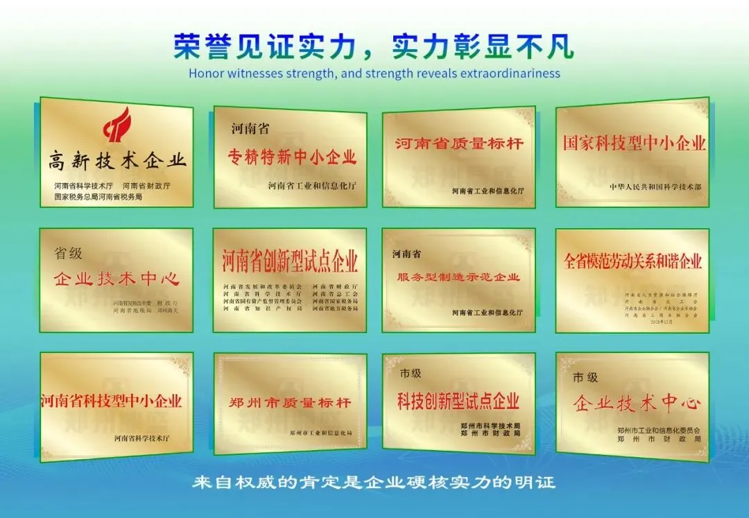 郑州鼎盛曾先后荣获国家高新技术企业、国家科技型中小企业、河南省专精特新中小企业、河南省质量标杆、河南省科技型中小企业、河南省服务型制造示范企业、河南省新一代信息技术融合应用新模式示范项目、河南省模范劳动关系和谐企业等荣誉,并拥有100多项核心技术和专利(一种新型分离辊可便捷变径的风选机(专利号:ZL 2024 2 1819591.0)、一种振动增强型陈腐垃圾处理专用滚筒式分离机(专利号:ZL 2024 2 0936611.6)、双频双级轻物质风选机(专利号:ZL 2024 2 1812784.3)等)。诸多荣誉加身,是对郑州鼎盛研发实力、创新生态与综合竞争力的最有力见证。