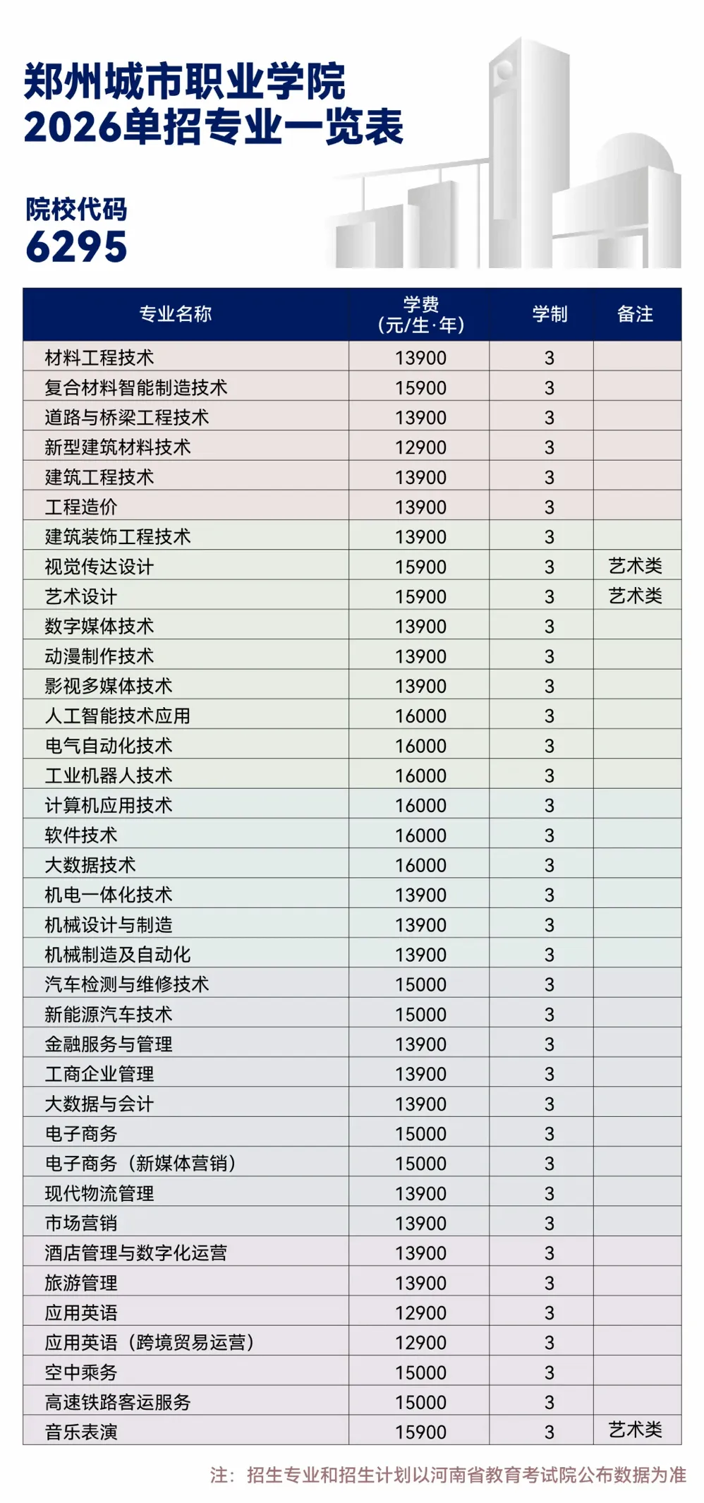 按照河南省教育厅、河南省财政厅、郑州市发改委规定的收费标准进行收费,具体各专业学费详见专业信息表,住宿费标准为1400元/生·年(六人间,无独立淋浴间、卫生间)、1500元/生·年(六人间,有独立淋浴间、卫生间)和1500元/生·年(四人间,有独立淋浴间、卫生间)。