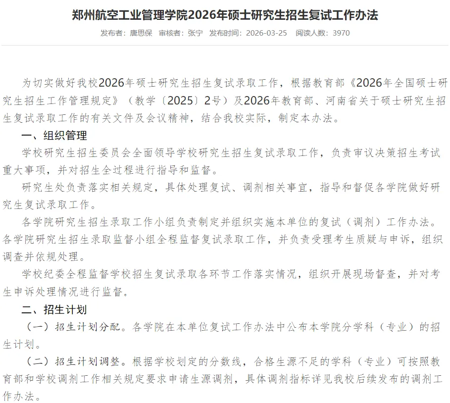 >郑州航空工业管理学院2026年复试办法及复试分数线已出,需要的同学及时关注!