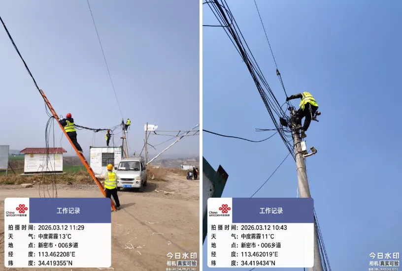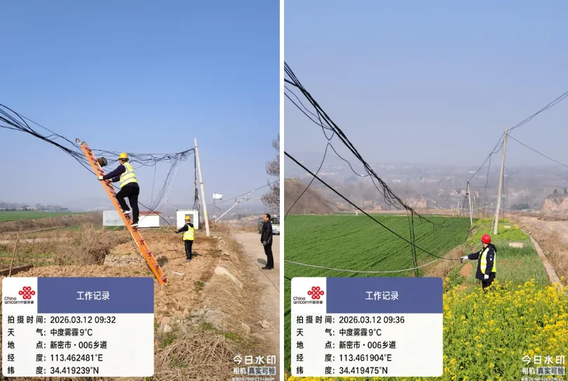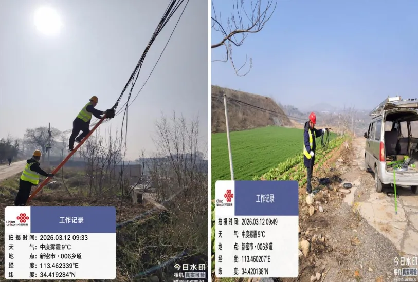 郑州联通讯(新密分公司:石全伟、杨书伟)2026年3月10日,新密联通管线网格维护人员在例行巡检中发现,位于苟堂镇石庙村的架空通信线路因地形变化和长期使用,出现多处线缆垂度偏低现象,最低处距地面不足4米,对过往车辆及行人构成安全隐患。该段线路承载着石庙村及周边200余户村民的宽带通信、移网信号覆盖及村级平安监控系统数据传输,是山区群众日常生活和乡村治理的重要通信通道。
