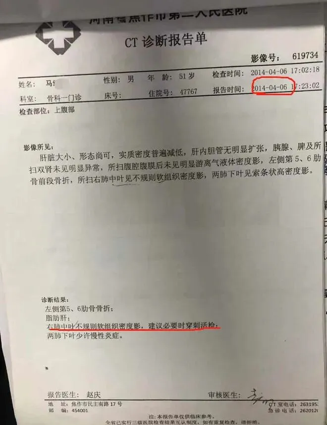 2014年,河南的马师傅出了一场车祸。方向盘狠狠顶了一下他的胸部,到医院一检查,片子显示“肺部占位”。再一活检,5月19号结果出来:左肺腔内型乳头状鳞癌。