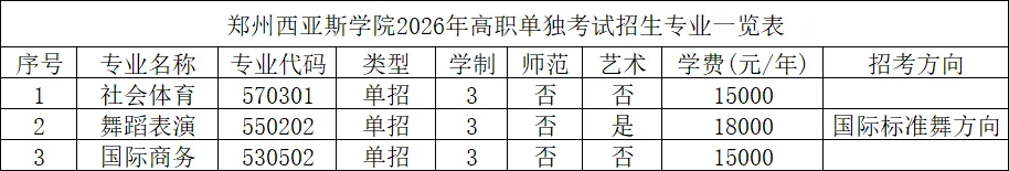 4. 录取办法:录取原则是分数优先、遵循志愿。根据考生志愿,按考核总成绩分项目从高到低依次录取,出现多人分数并列情况时,舞蹈表演专业按照剧目表演分数从高到低录取;社会体育专业如有项目录取不满,招生计划调剂到其他项目,同项目考核总成绩并列时,身高者优先;国际商务专业按职业技能测试成绩从高到低录取。