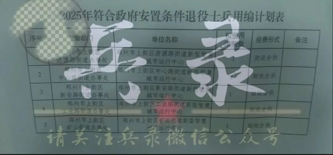 【河南省郑州市上街区】2025年度符合政府安排工作退役士兵安置岗位公示