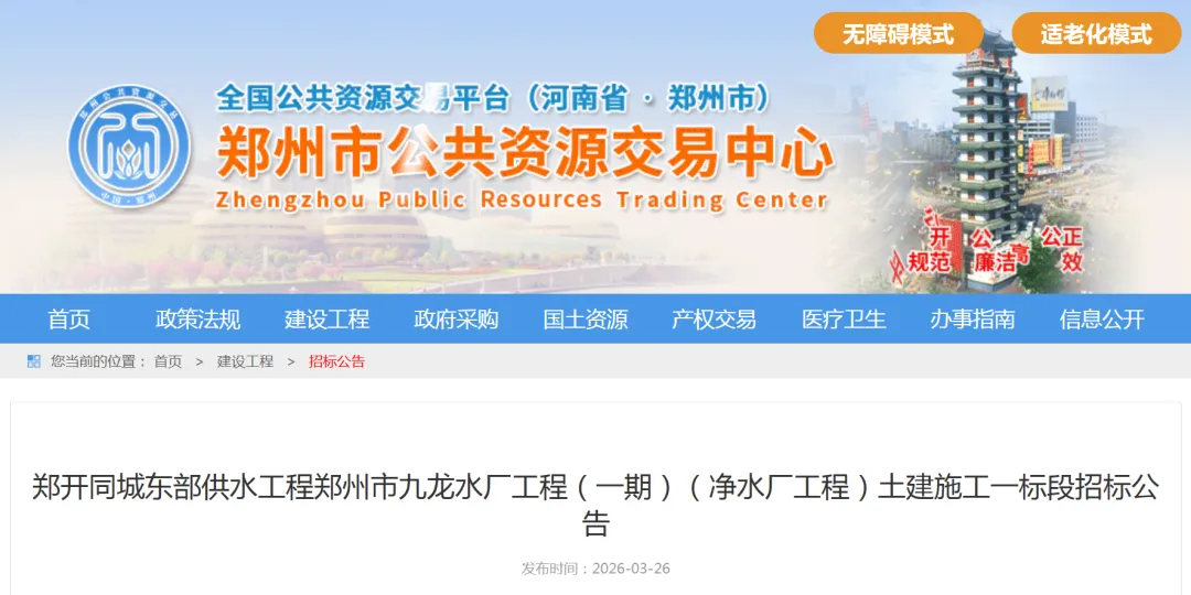 近期,郑州市公共资源交易中心密集发布多条招标公告,九龙水厂(一期)已进入全面招标阶段,涵盖土建施工、清水管线、土方清运、顶管劳务、钢板桩、质量检测、水泥搅拌桩、降水及基准点测绘等多项内容,标志着项目正式进入实质性建设阶段。