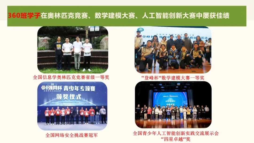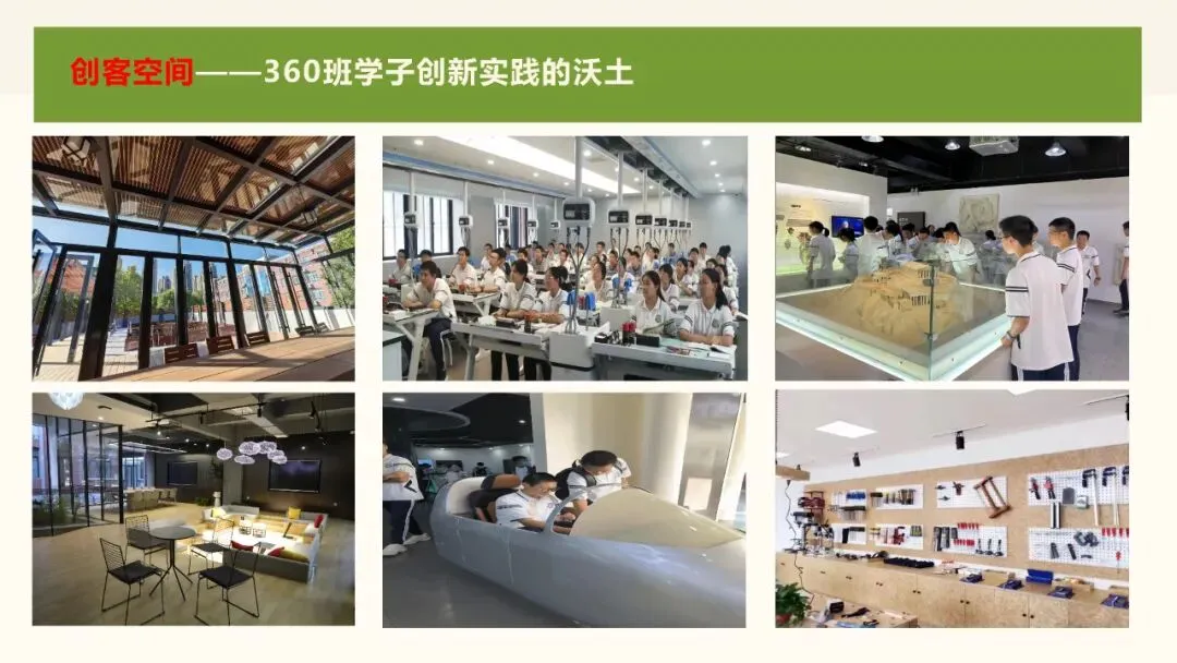 2018年,在知名校友360集团创始人周鸿祎的大力支持下,创立了360创新班。课程设置上,加强数学、物理的学习,开设“设计思维”“工程制造”等课程,拓展学生创新思维,加强动手操作能力。量身定做“强基计划”,成立科学素养中心,融合高校优质资源,依托六大创新实验室及创客空间,组织参加科技创新大赛,为强基计划创造条件。管理上,实行“双导师”制,由科任教师担任学生的学业导师,关注学生在校期间的成绩和心理变化;由360公司专业人员和大学教授担任学生的人生导师,定期与学生进行沟通并提出生涯规划方面的建设性意见。结合学生的发展情况,选拔优秀学生以外出研学的形式走进知名公司,实地体验,激发学生为自己的未来做好规划。