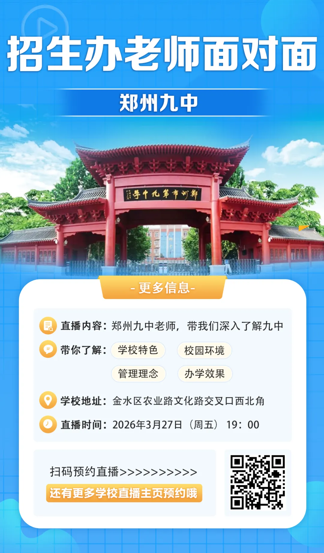 明晚九中学校老师将来到咱们直播间,学校更详细的内容,大家可以扫码预约明晚直播哦!