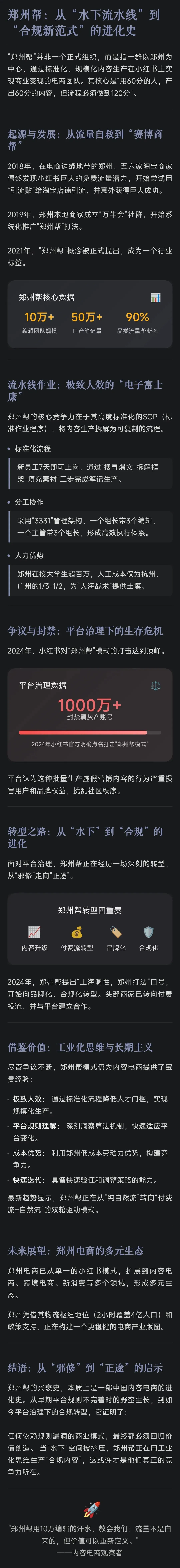 郑州帮的兴衰史,本质上是一部中国内容电商的进化史。从早期平台规则不完善时的野蛮生长,到如今平台治理下的合规转型,它证明了:任何依赖规则漏洞的商业模式,最终都必须回归价值创造。 当“水下”空间被挤压,郑州帮正在用工业化思维生产“合规内容”,这或许才是他们真正的竞争力所在。