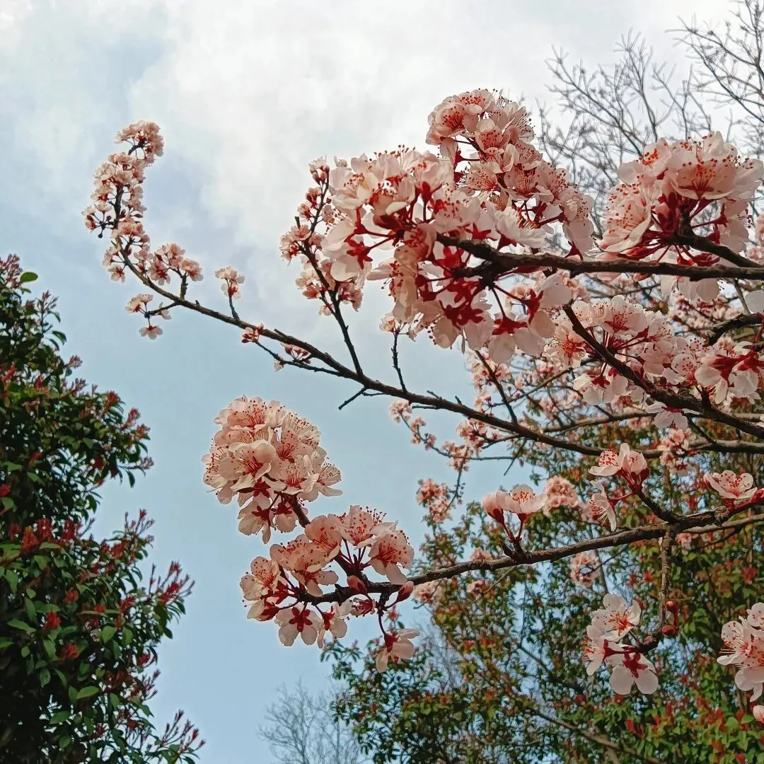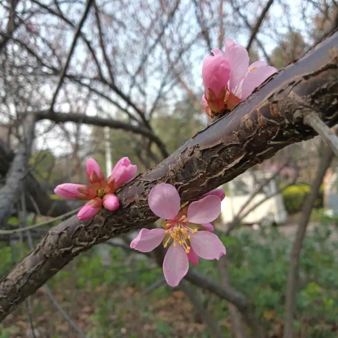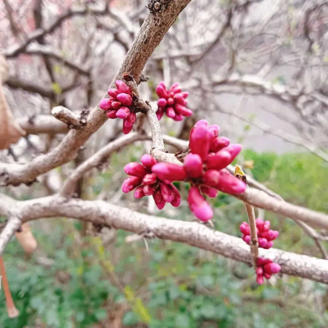 有的呢,却是枝条上先抽出新绿,或者是紫红,或者是鹅黄,然后在叶子的掩护下,才开始打苞开放,好像是害羞的小姑娘,躲在妈妈衣服后面,又好奇的偷偷弹出脑袋来。