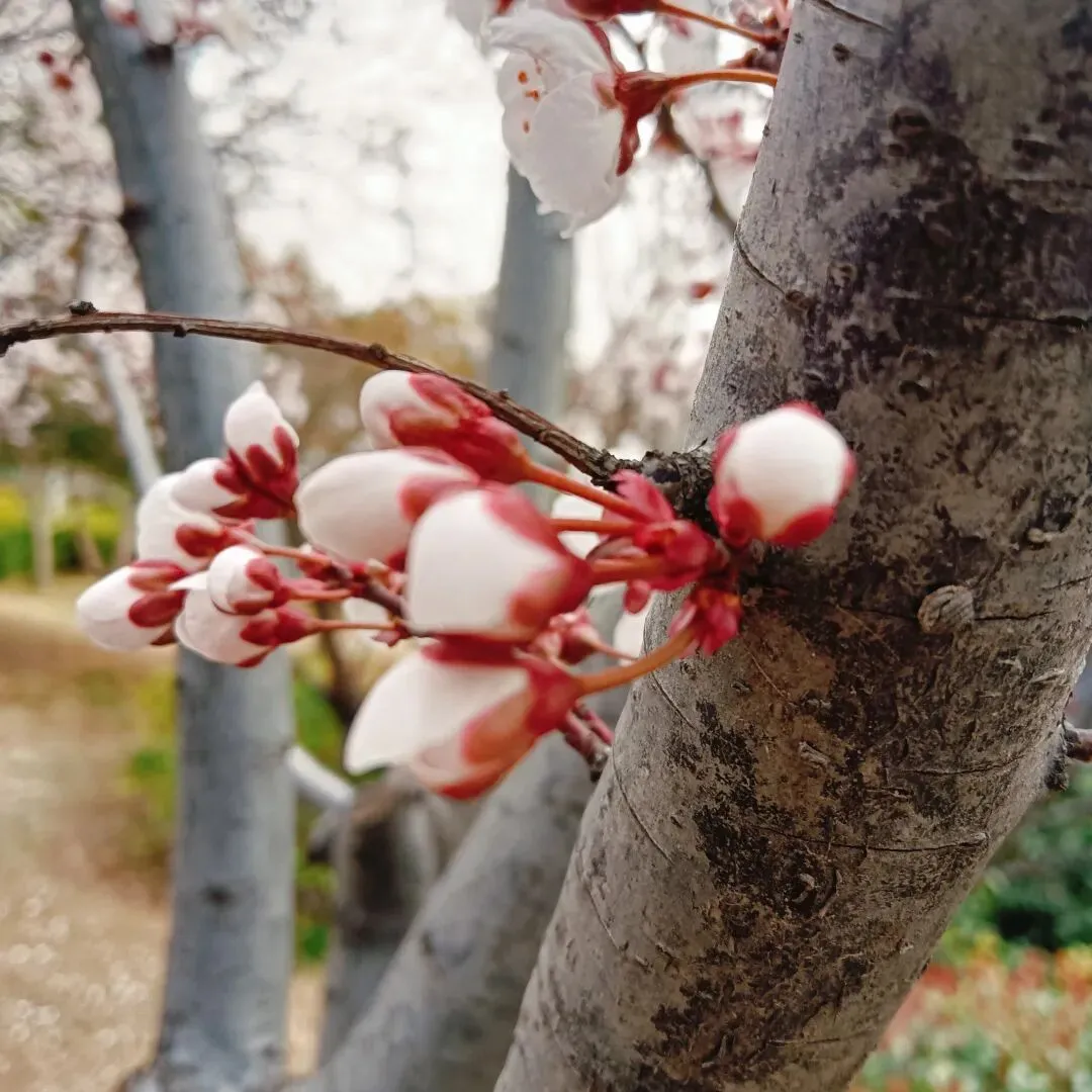 看这些开满花的树,有的是花瓣绕着枝条围成一圈,一片叶子都没有。