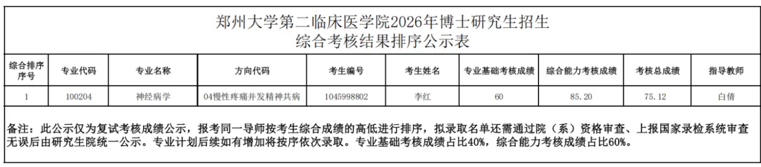 郑州大学临床医学院(048)2026年博士研究生招生考核成绩公示