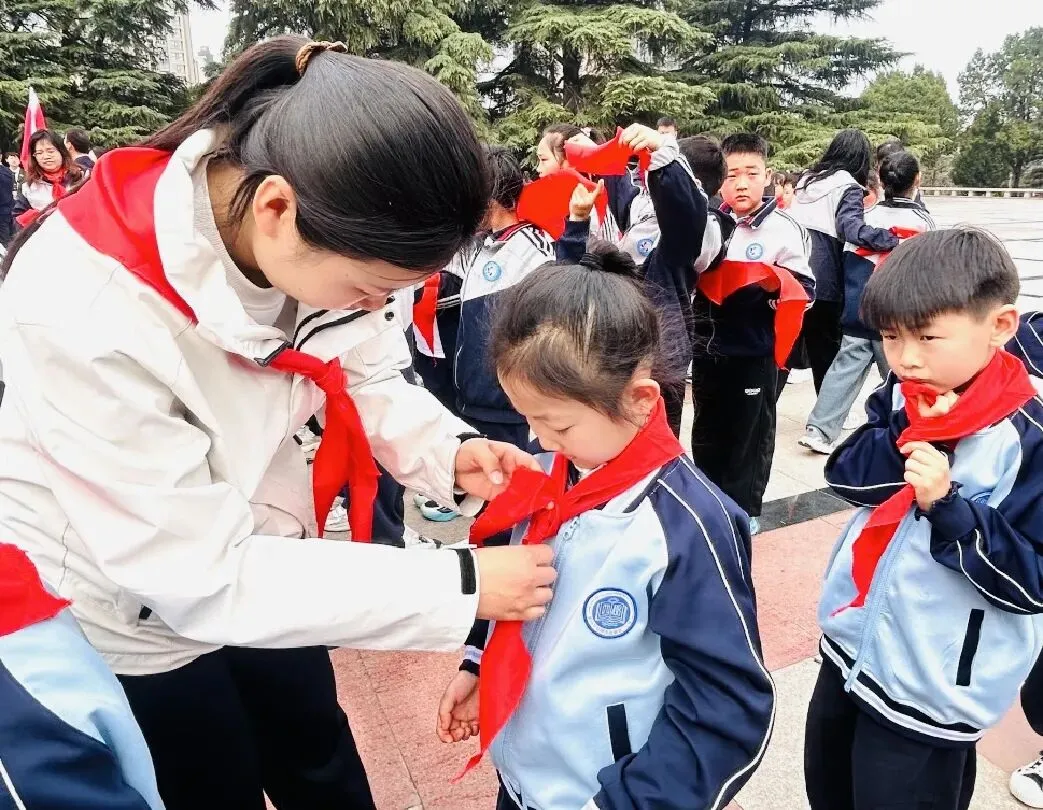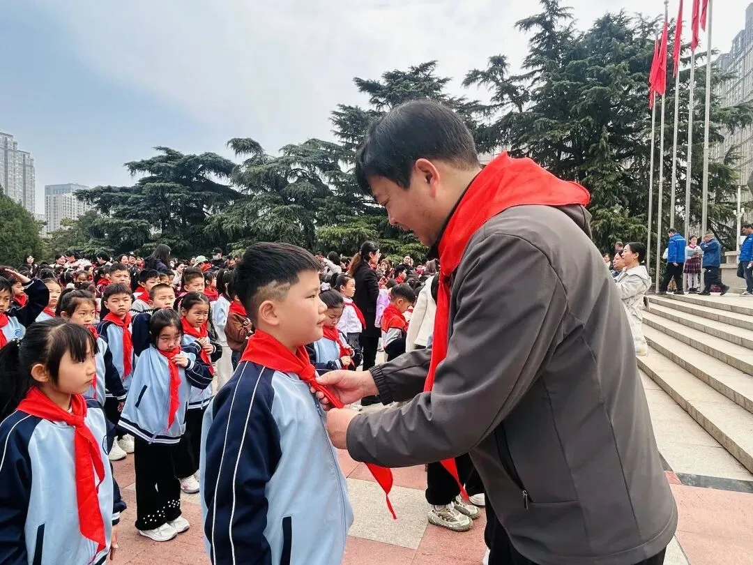 郑州市中原区西郡第二小学少工委主任、校长许玉峰等为新队员佩戴红领巾。
