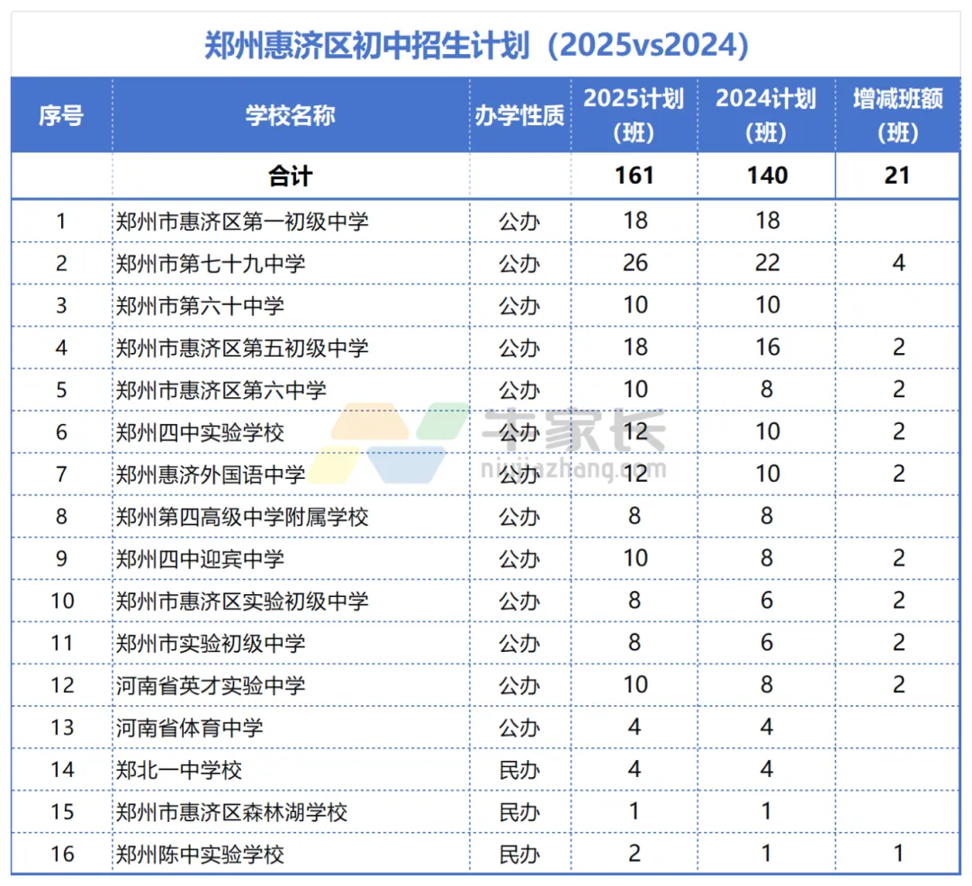 根据2025年招生计划,郑州惠济区共有16所初中招生(含公办13所、民办3所),总计划招生161个班。2025年比2024年整体招生增加21个班。