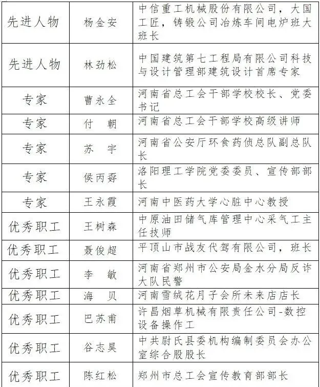 据了解,组建“中国梦·劳动美”全国职工宣讲团是升级打造“中国工人大思政课”的重要举措,目前,宣讲团下设巾帼分团、新就业形态劳动者分团、华北东北分团、华东分团、中南分团、西南分团、西北分团等7个分团,共计1139人。其中,河南30人入选,郑州市占8人。推荐类别为先进人物、专家名师、优秀职工宣讲员3类(名单附后)。