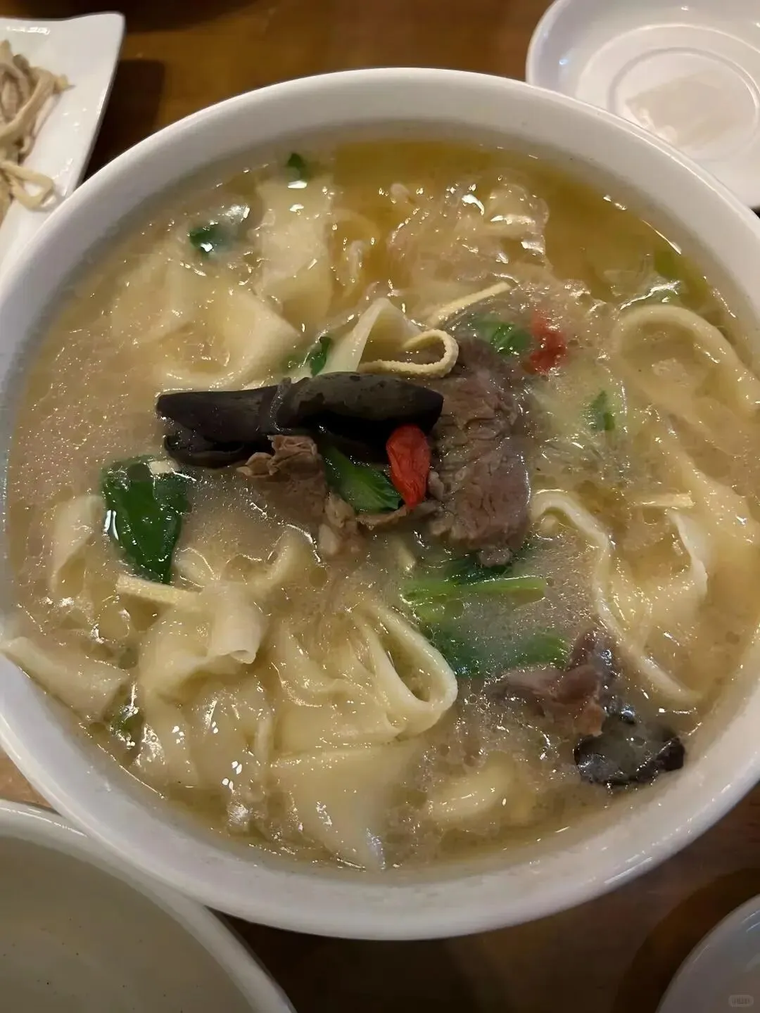 喝这碗汤时,先别急着夹面。就那么小抿一口,让汤香在口腔里慢慢散开——微微的羊香、香料的余韵、清鲜的回甘,层次分明,却又浑然一体。