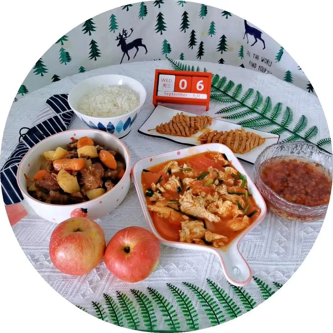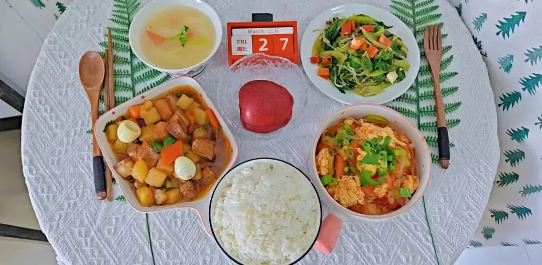 大米、鹌鹑蛋红烧肉、青椒番茄炒蛋