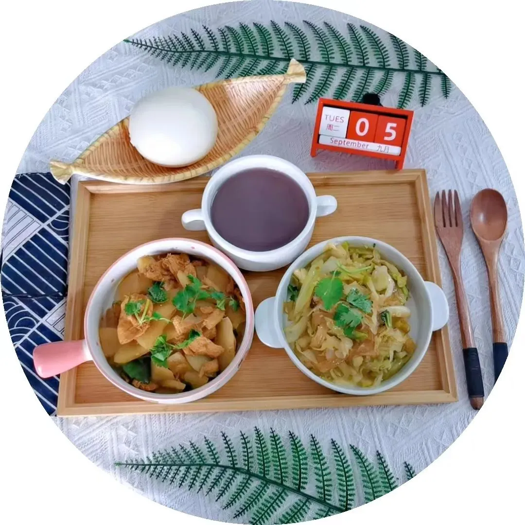 馒头、青椒土豆肉片、青菜烧腐竹、南瓜粥