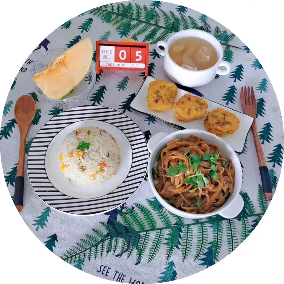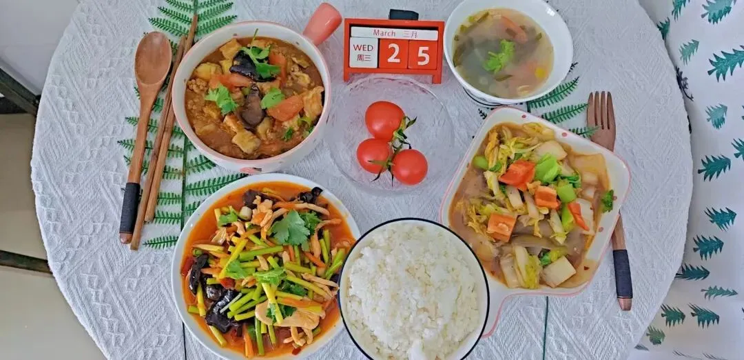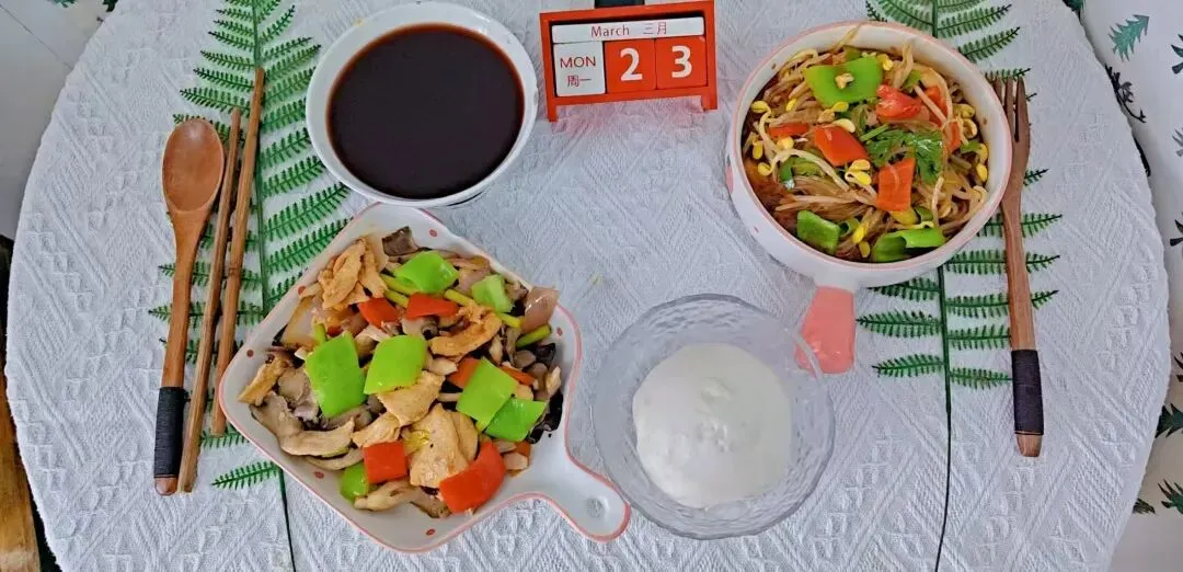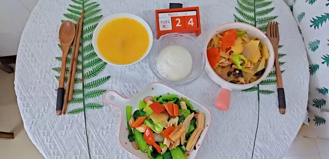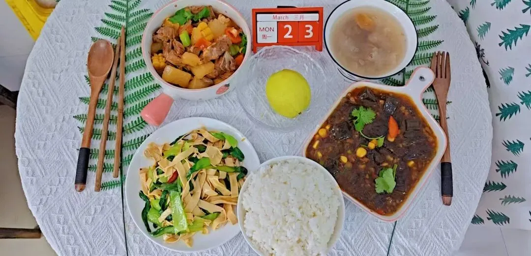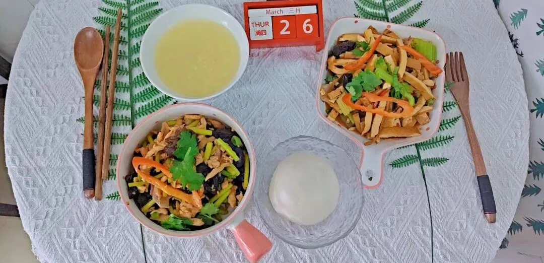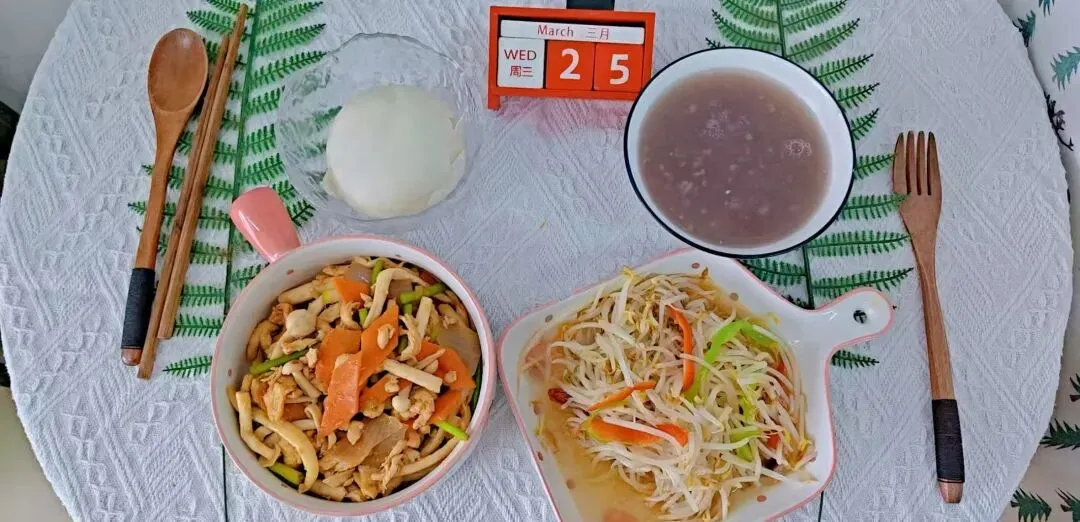 馒头、木耳蒜苔炒肉丝、西芹炒豆干、小米粥