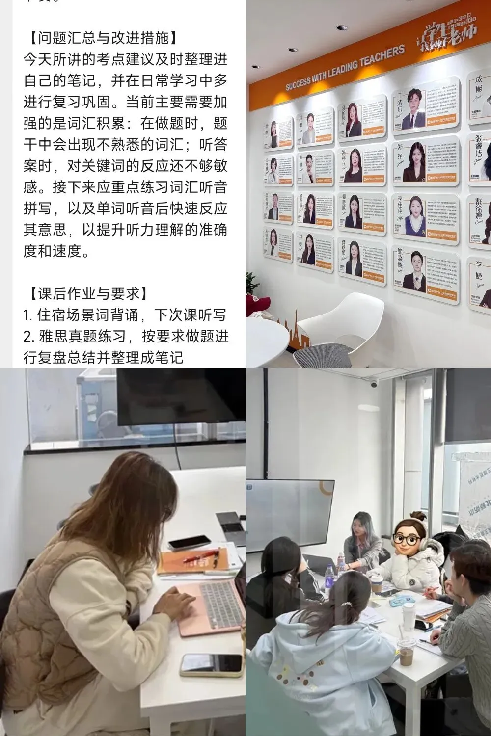 雅思教学师资人均七年以上教学经验,从课堂讲解到课后反馈,始终全程在线。课堂上,老师会实时记录并反馈学生的课堂表现;课后,正课老师精细化批改作业,掌握学生的知识点情况。