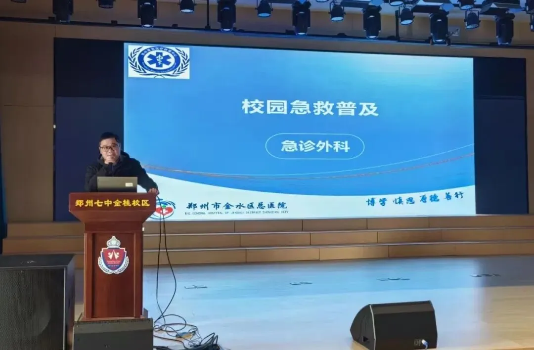 专题授课环节中,郑州市金水区总医院急诊外科副主任、普外专业李魏副主任医师担任主讲人,他围绕相关法律、急救目的,详细讲解了烧烫伤、扭伤、鼻出血的处理方法,以及脑出血、意识不清、中风、胸闷胸痛、抽搐、中暑、触电、动物咬伤、蜂蜇伤、中毒、溺水等突发状况的应急处置要点,并系统讲授心肺复苏与气道梗阻哈姆立克急救法,为在场师生传授实用急救技能。