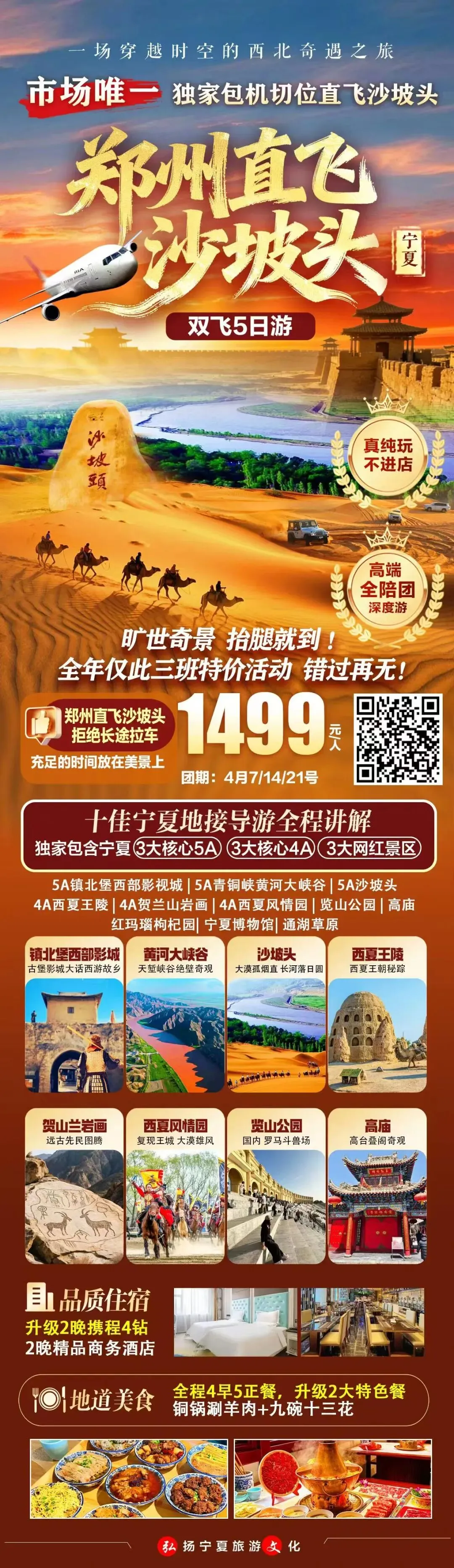 ️郑州直飞沙坡头市场独家首发-震撼来袭落地安排宁夏欢迎仪式黄金正点航班:去10:35-回13:20团期:4月7号/14号/21号