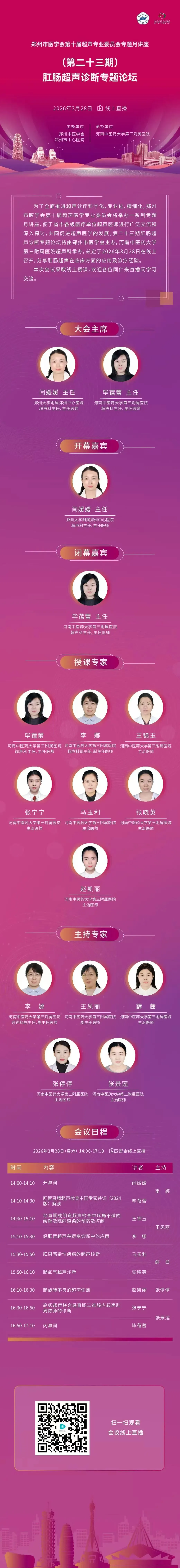 为了全面推进超声诊疗科学化,专业化,精细化,郑州市医学会第十届超声医学专业委员会将举办一系列专题月讲座,便于省市各级医疗单位超声医师进行广泛交流和深入探讨,共同促进超声医学的发展。第二十三期肛肠超声诊断专题论坛将由郑州市医学会主办,河南中医药大学第三附属医院超声科承办,兹定于2026年3月28日在线上召开,分享肛肠超声在临床方面的应用及诊疗经验。