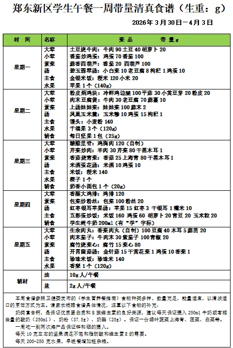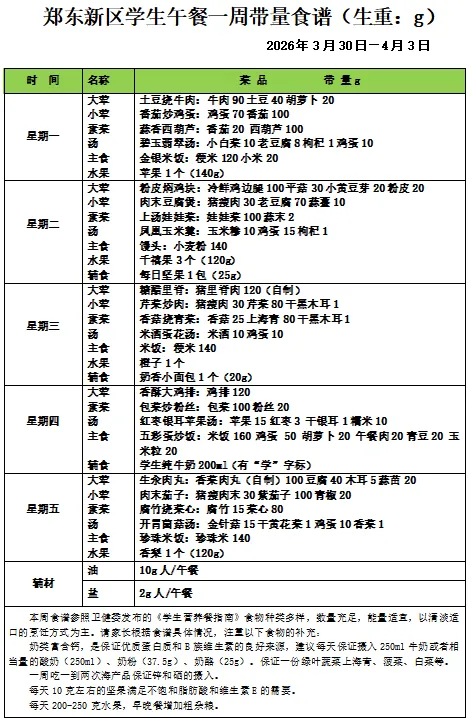 >郑州市郑东新区畅和街小学午餐一周(3月30日——4月3日)食谱