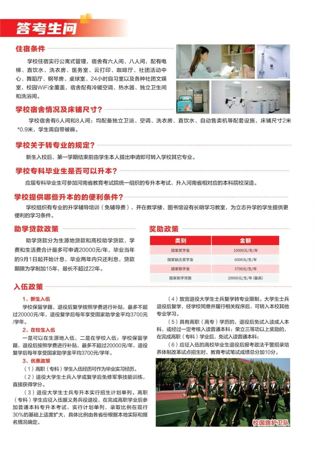 1.服兵役学费资助:自主择业的退役士兵,按政策规定,可申请学费减免,减免标准按所学专业的收费标准执行,每人每年最高20000元;学生在校或毕业后应征入伍,可申请学费补偿或助学贷款代偿,每人每年最高20000元。