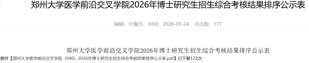 >郑州大学医学前沿交叉学院2026年博士研究生招生综合考核结果排序公示表