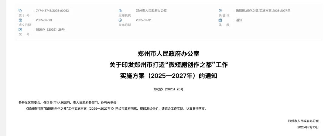 产业规模持续攀升,彰显强劲活力。2024年,郑州微短剧市场规模突破23亿元,同比增长28.3%,19家企业营收超千万,3家跻身“亿元俱乐部”。更重要的是,郑州早已布局产业升级,2024年10月发布的扶持政策,明确提出2027年实现市场规模100亿元、打造“微短剧创作之都”的目标,为产业发展注入政策动力。