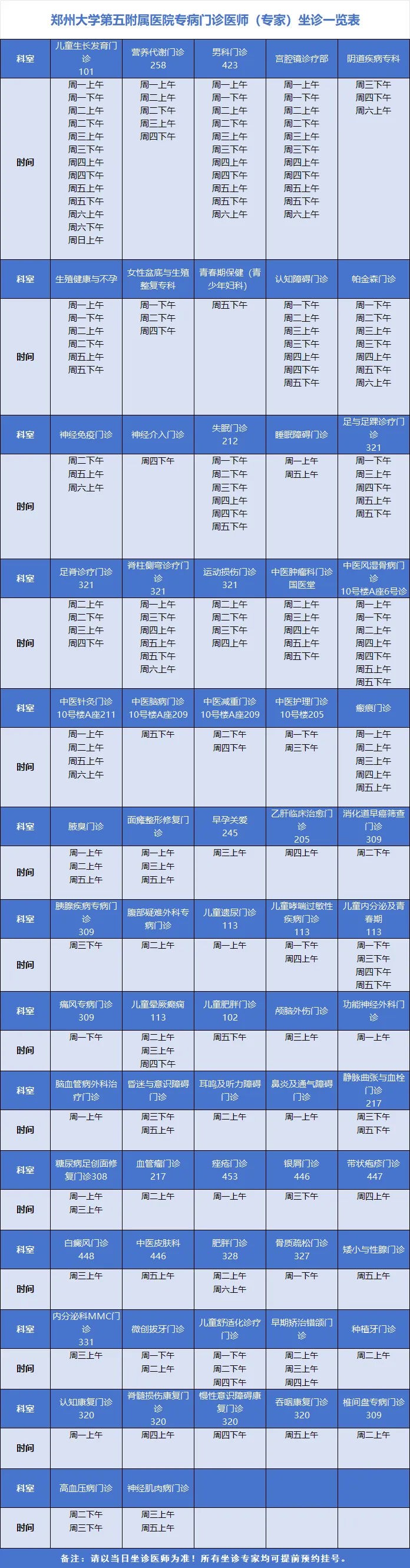 专病门诊医师(专家)坐诊一览表