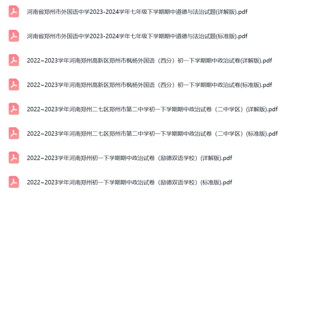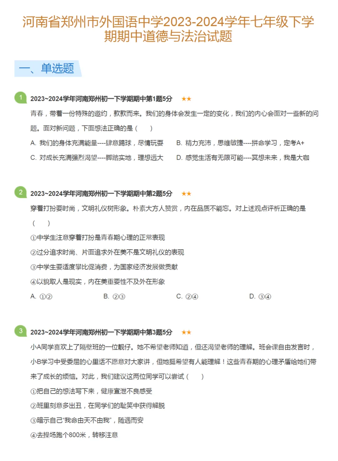 8套2022-2024学年河南郑州初一下学期期中政治试卷及答案解析
