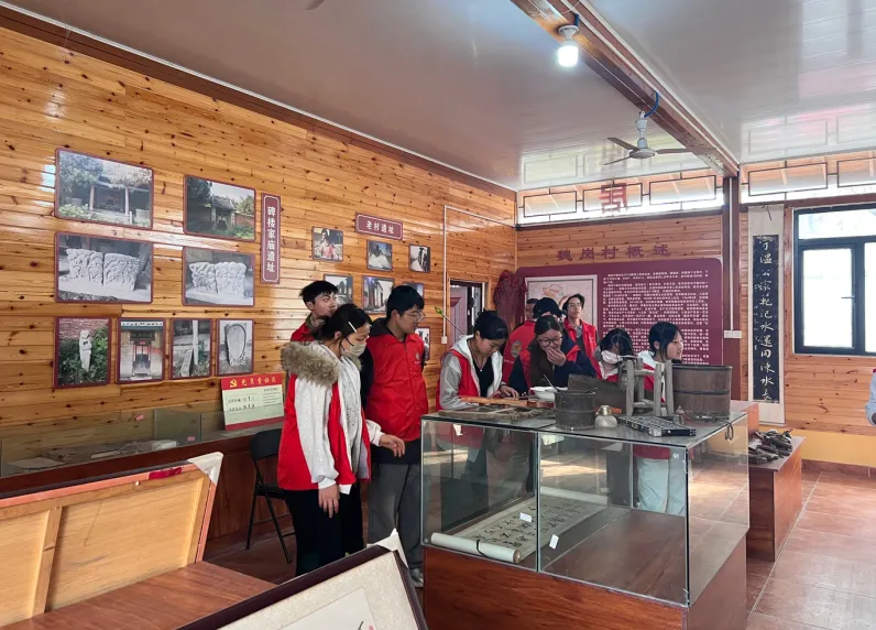 一张张泛黄的老照片、一件件充满年代感的农具、一段段详实的文字记录,生动再现了魏岗村从传统农业村落向现代化社区转型的沧桑巨变。师生们驻足凝视,认真聆听魏岗村老一辈创业者战天斗地、艰苦创业的感人故事,深刻感受着这片土地上蕴含的勤劳勇敢、自强不息的精神力量。