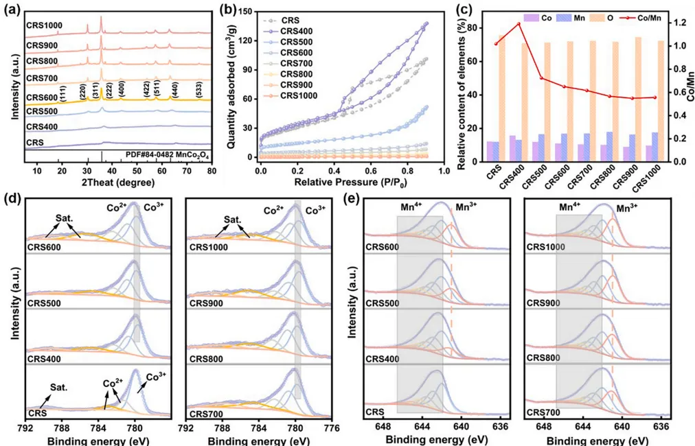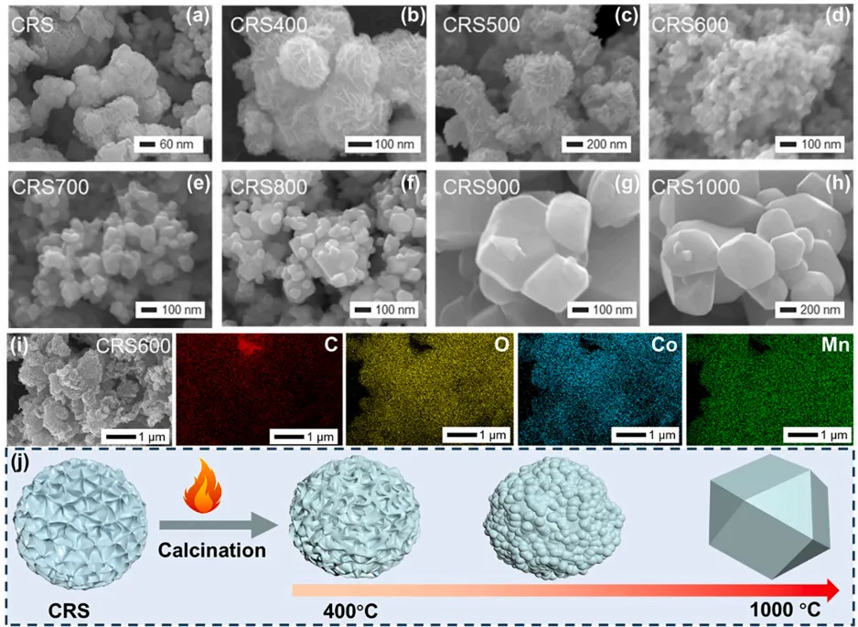 在扫描电镜下,原始钴渣呈现美丽的万寿菊状微球结构(图2a),由二维纳米片层层组装而成。随着温度升高,这些“纳米花”开始重组:600°C时形成规整的多面体结构(图2d),就像经过精心雕琢的水晶。X射线衍射结果更令人兴奋——当温度达到500°C时,材料中开始出现锰钴尖晶石的特征峰!