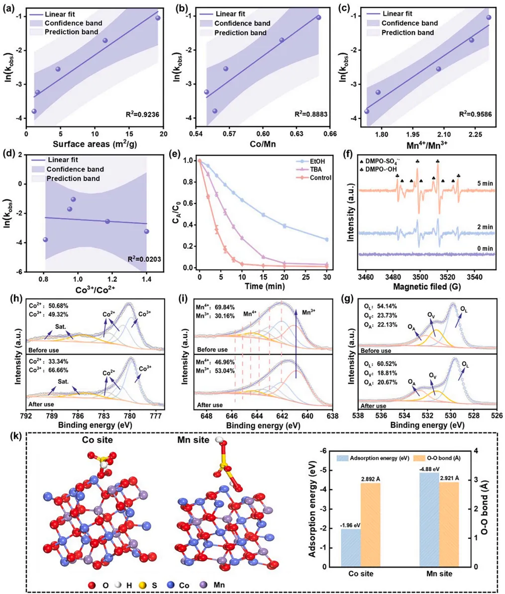 XPS分析进一步证实:反应后催化剂表面的Mn⁴⁺比例从69.84%降至46.96%,而Mn³⁺相应增加,说明锰确实参与了电子转移(图4i)。同时,钴的价态也发生变化,Co²⁺/Co³⁺在反应过程中相互转化,与锰形成完美的“ redox二人转”。