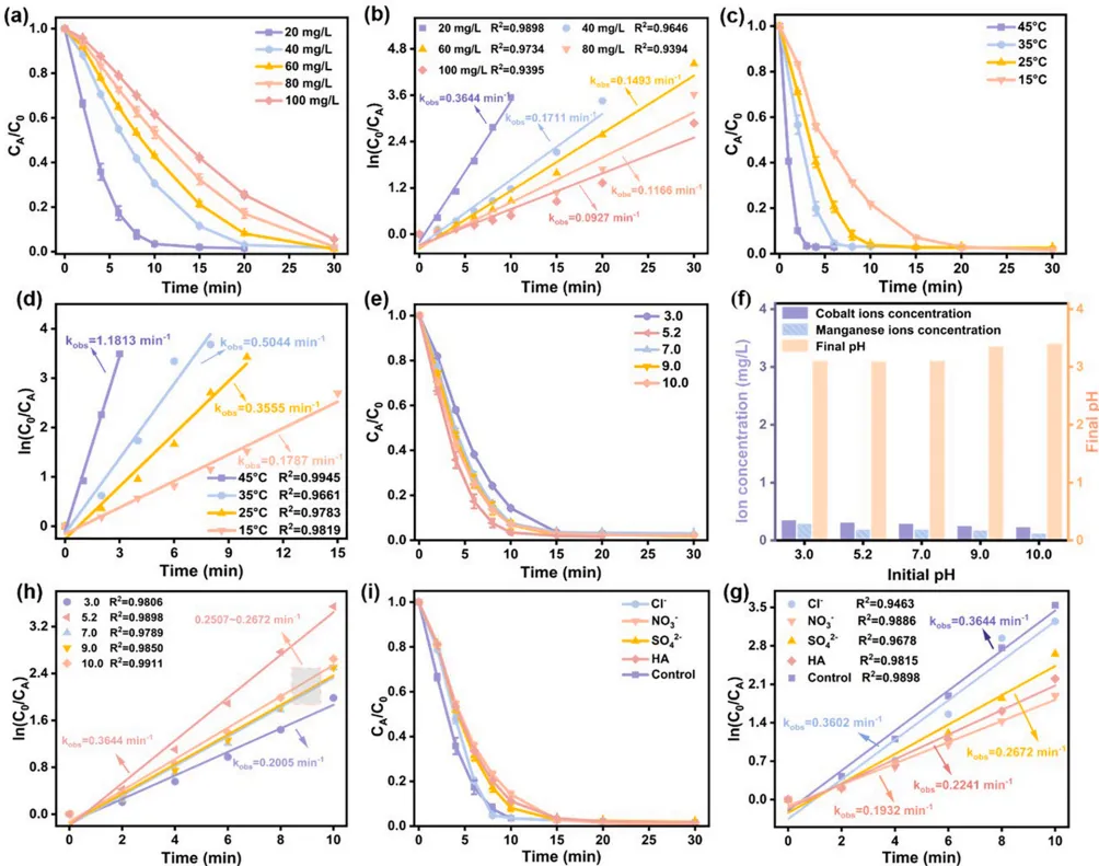 抗干扰能力MAX:即使存在氯离子、硫酸根、硝酸根等常见杂质,或40 mg/L的腐殖酸,RhB降解率依然超过98%(图6i),展现出色的环境适应性。