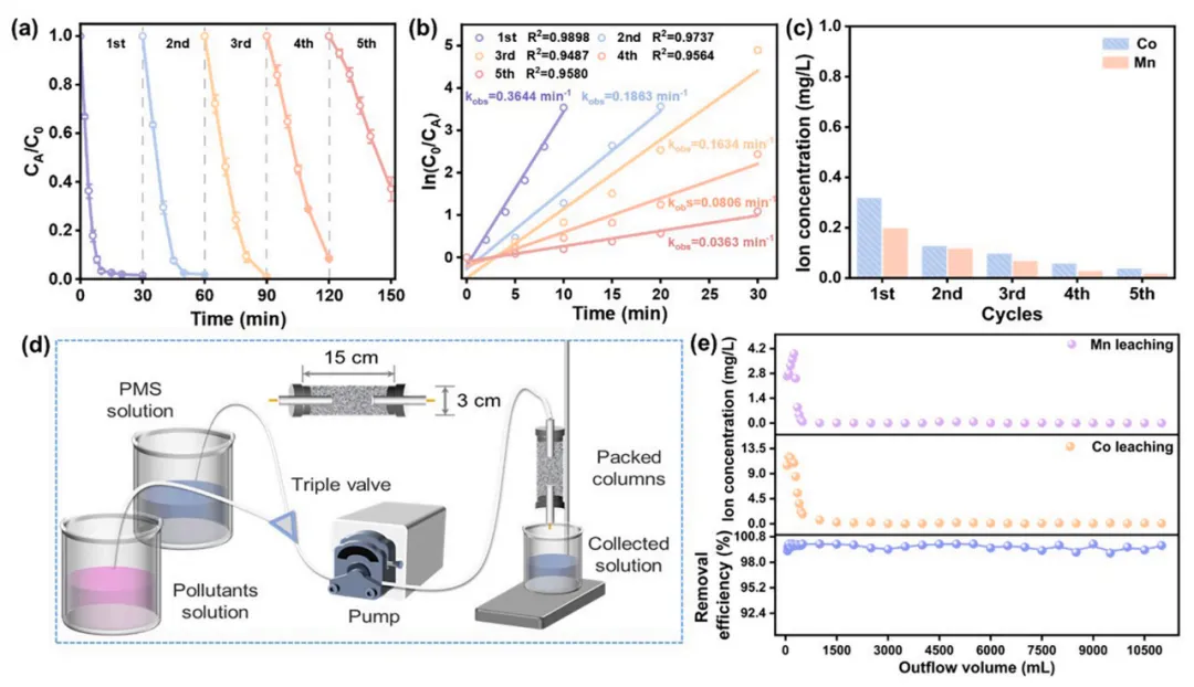 最妙的是,600°C煅烧得到的CRS600催化剂表现最佳:仅需15分钟就能降解98.01%的罗丹明B染料,速率常数高达0.3644 min⁻¹!这速度比很多贵金属催化剂还要快(图1e)。而且金属浸出浓度极低(钴0.1-0.36 mg/L,锰0.1-0.30 mg/L),远低于国家排放标准。