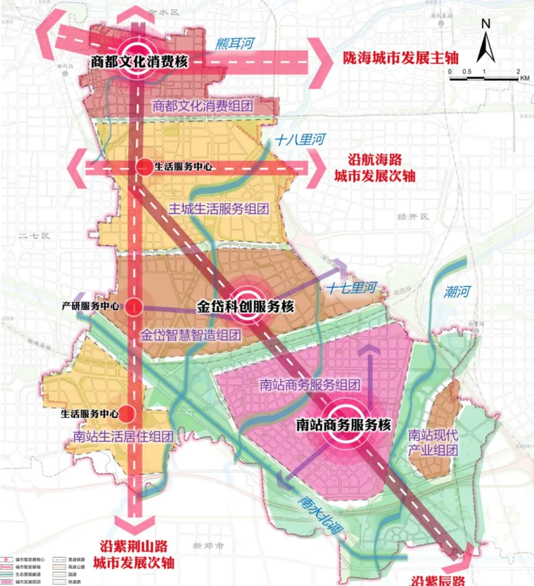 空间格局:“三核引领、四轴联动、五水融城”,打造商都文化消费核、金岱科创核、南站商务核,文旅、科创、商务协同爆发。