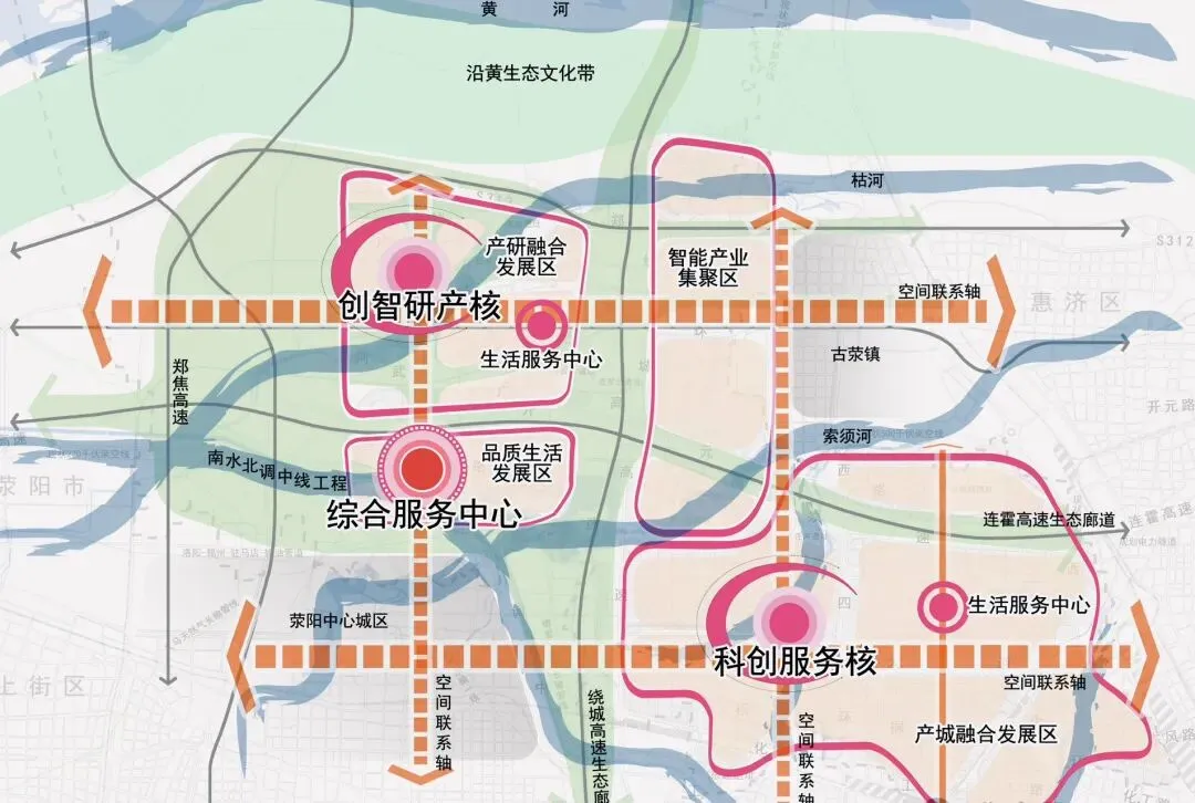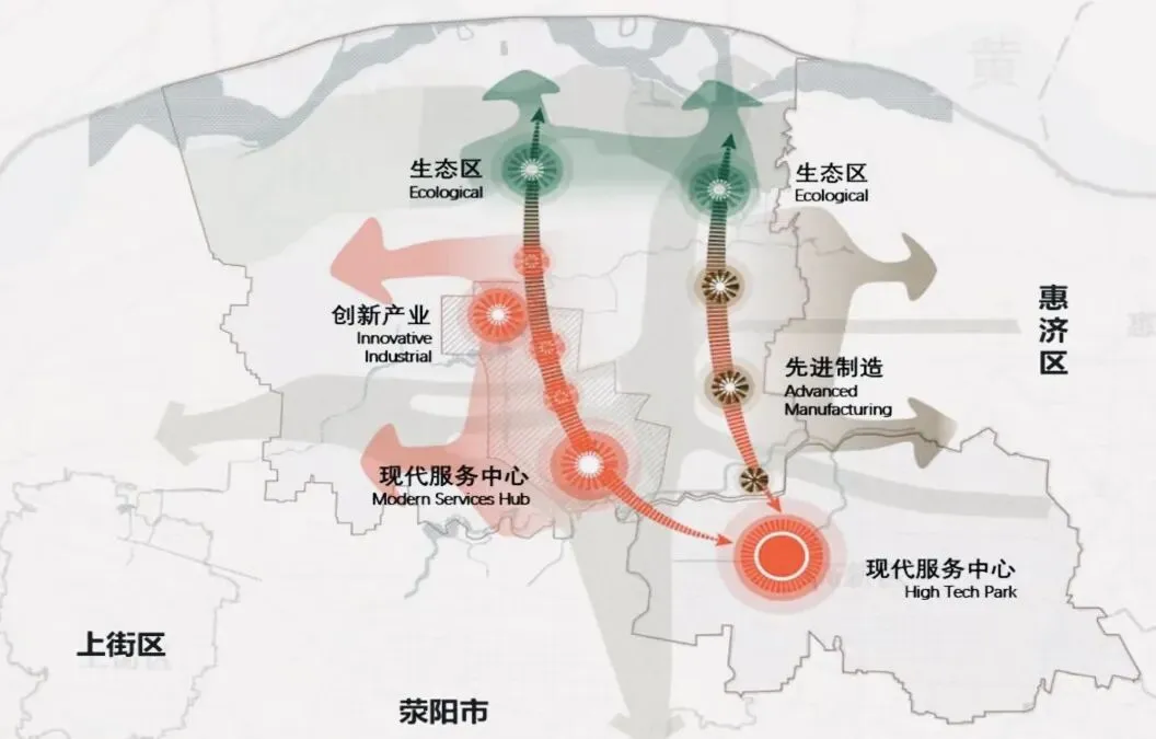 • 四轴引领:以科学大道、红松路、荥广路、北四环为四大发展轴,串联起各个功能片区,实现区域协同发展