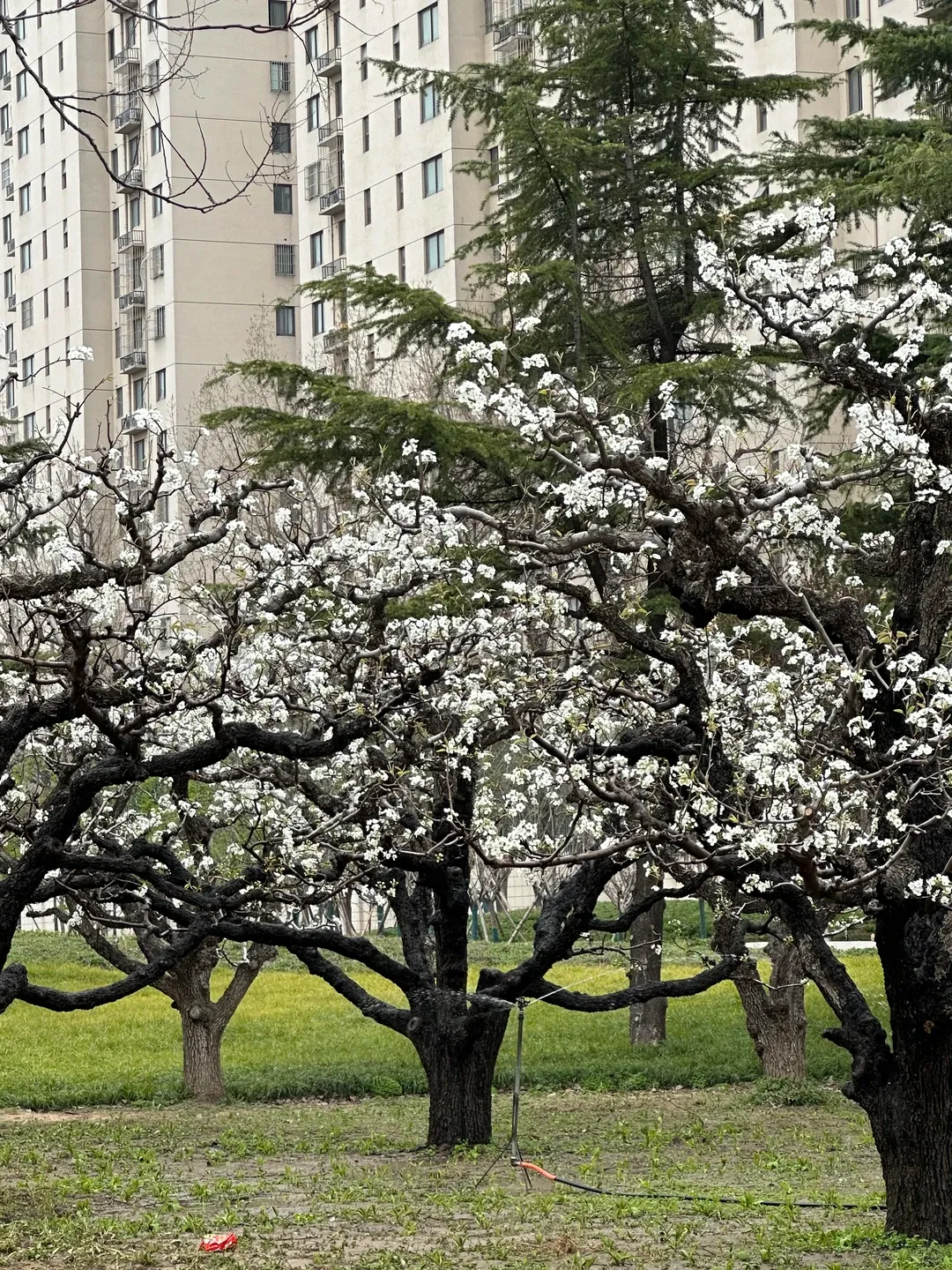 我现在就在公园里,目之所及全是白茫茫的梨花。一树树、一簇簇,洁白的花瓣挂满枝头,像落满了雪,又像随风摇曳的风铃。