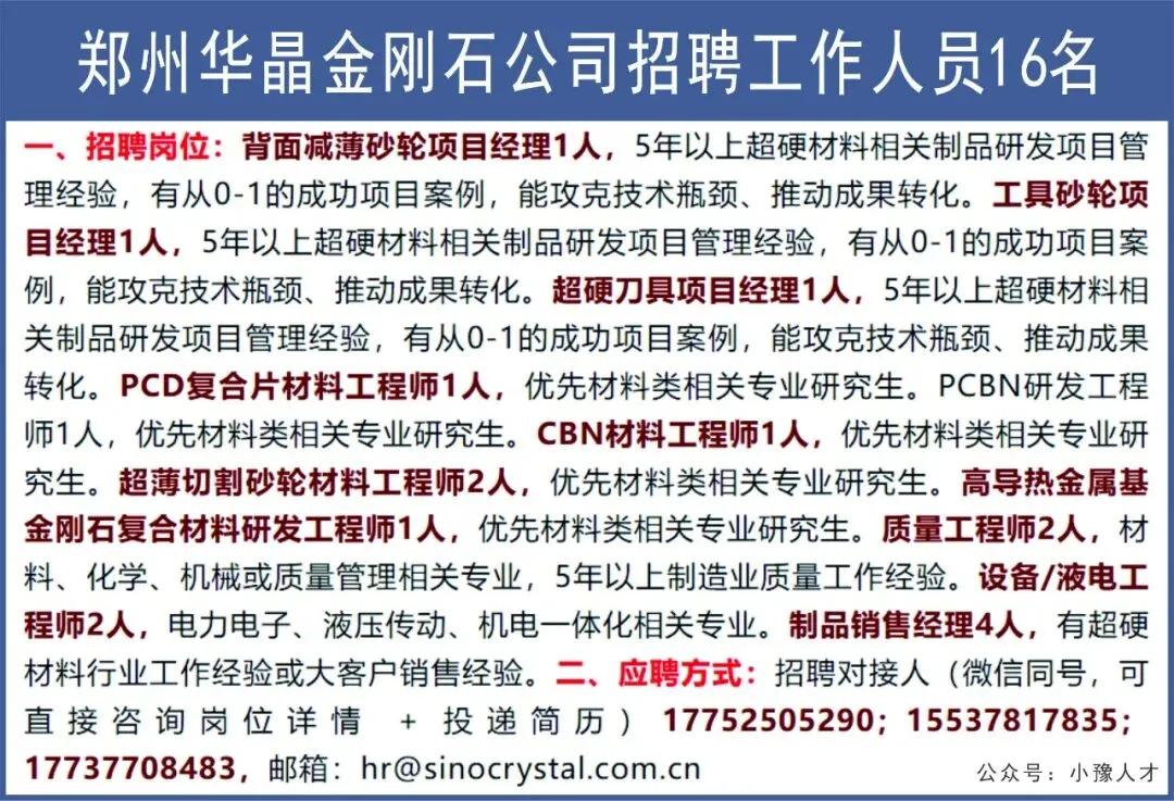 郑州华晶金刚石公司招聘工作人员16名