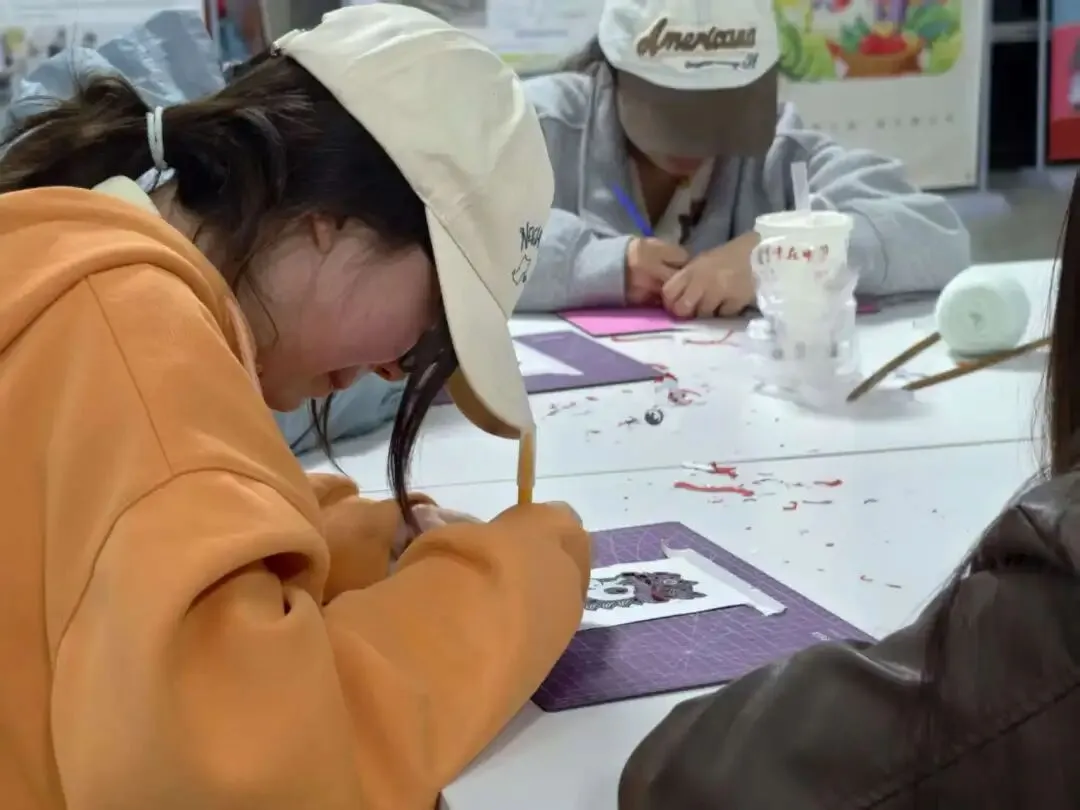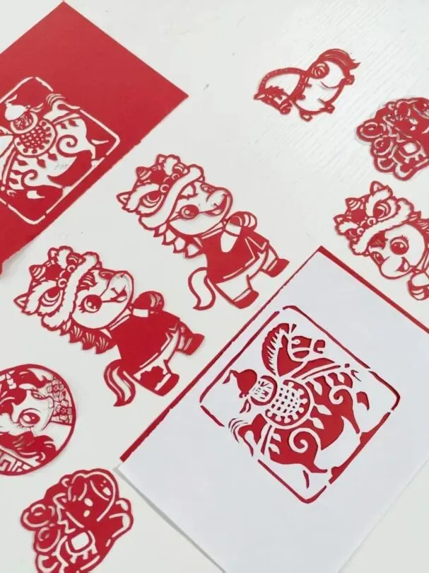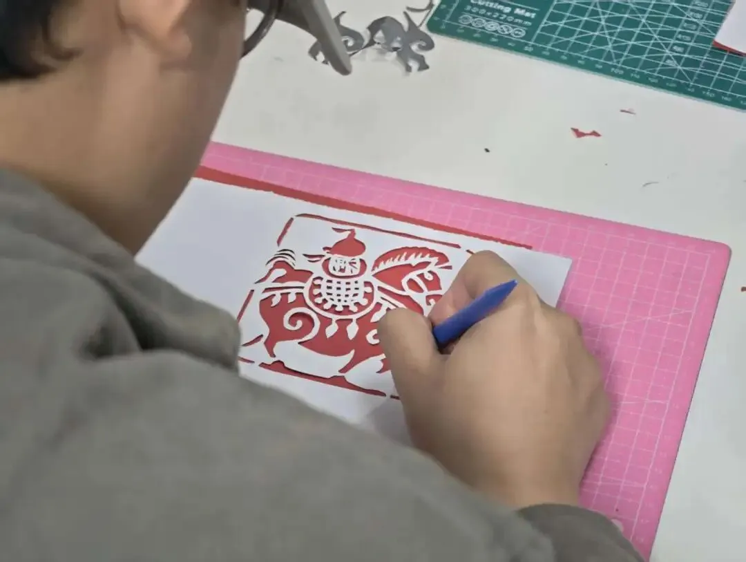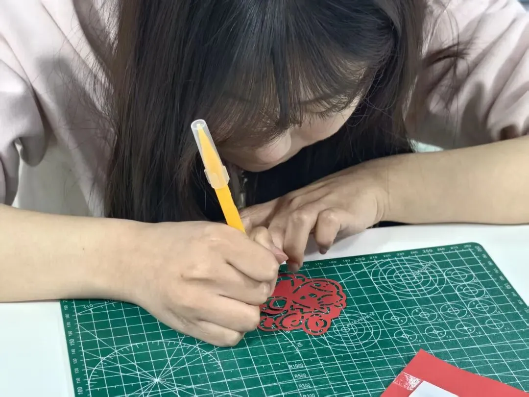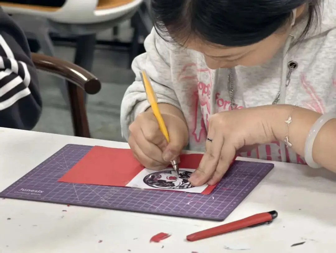 社团课上,同学们热情高涨,熟练运用刻刀在纸面上细致刻画。与传统剪纸使用剪刀裁剪不同,刻纸技艺更注重刀法的精准与创作者的耐心,不仅需要精准掌握运刀力度,更要兼顾线条的连贯性与完整性。在麻梦琳老师的耐心指导下,同学们认真聆听技巧讲解、反复练习运刀手法,逐渐掌握了刻纸的基本技巧。刻刀在同学们的指尖轻盈流转,红色纸屑纷纷飘落,原本平整的红纸之上,一匹匹身姿矫健、神态灵动的小马图案逐渐显现,每一笔刻画都饱含着同学们对传统艺术的热爱与敬畏。