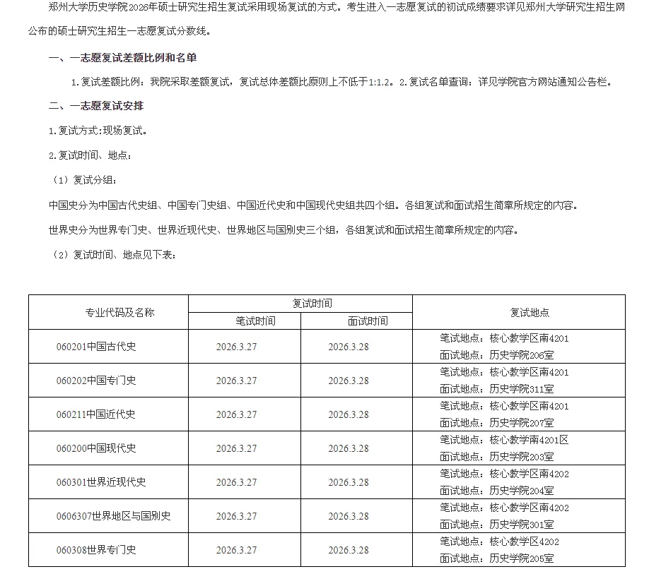 26历史考研复试 | 郑州大学2026年硕士研究生招生复试基本分数线及一志愿复试名单