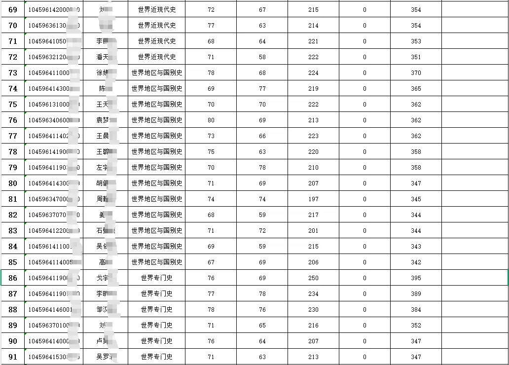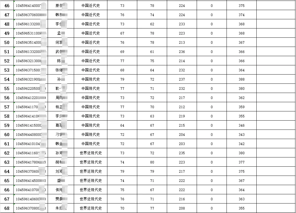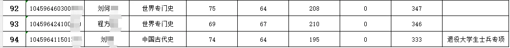 历史学院中国古代史计划招生16人,一志愿上线人数22人,初试最高分405分,初试最低分357分。士兵计划1人333分。中国专门史计划招生13人,一志愿上线人数16人,初试最高分394分,初试最低分356分。中国近代史计划招生12人,一志愿上线人数15人,初试最高分389分,初试最低分364分。中国现代史计划招生 6人,一志愿上线人数8人,初试最高分388分,初试最低分342分。世界近现代史计划招生 8人,一志愿上线人数11人,初试最高分380分,初试最低分351分。世界地区与国别史计划招生14 人,一志愿上线人数13人,初试最高分370分,初试最低分342分。世界专门史计划招生6 人,一志愿上线人数8 人,初试最高分395分,初试最低分346分。