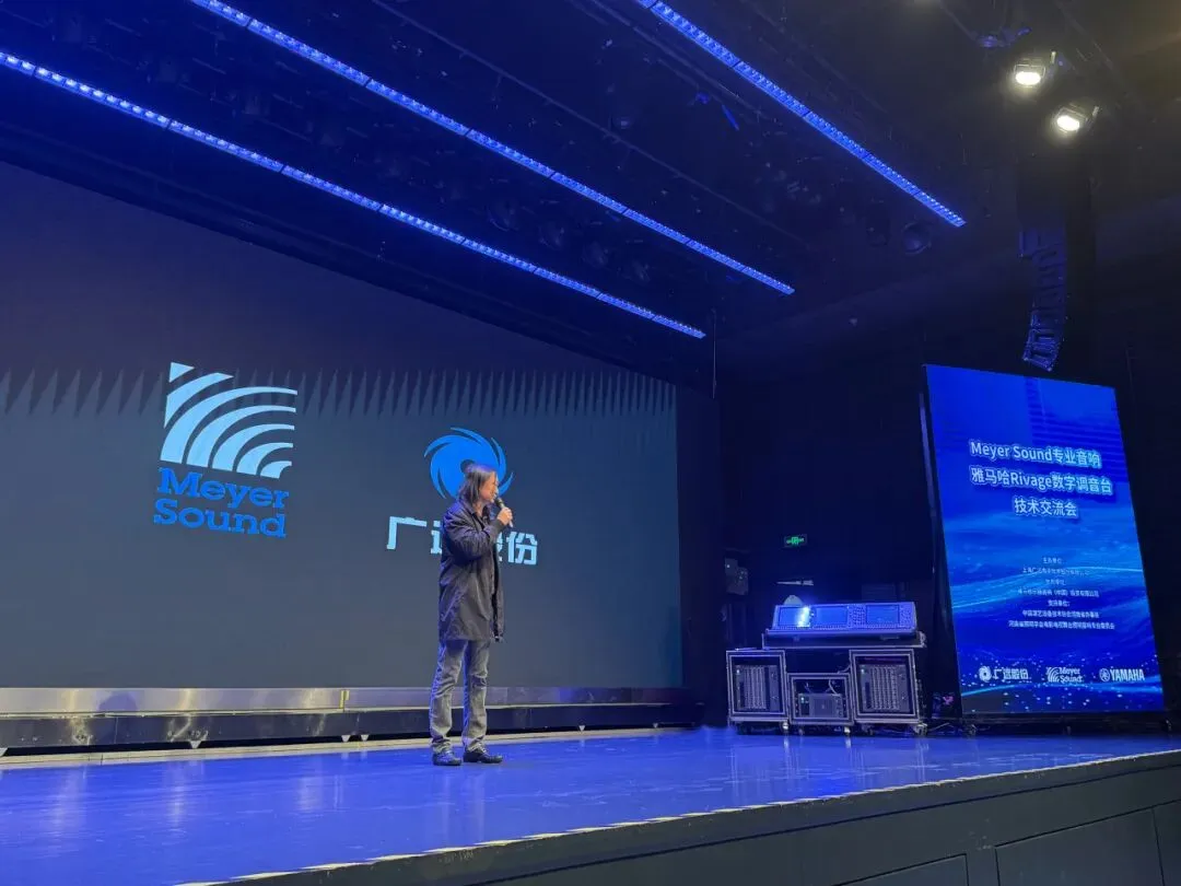 技术分享环节亮点纷呈、干货满满,成为本次活动的核心亮点。上海广远技术工程师王圆泽率先登场分享,他不仅对 Meyer Sound 全新产品进行了详尽解读,从产品核心性能、核心竞争优势到实际应用场景,展开全方位、多角度的专业讲解,让在场嘉宾对 Meyer Sound 的前沿技术与产品特性形成清晰且深入的认知;同时,作为河南艺术中心音响系统升级项目的核心参与者,王工结合河南艺术中心歌剧院扩声系统的实际落地案例,对项目音响系统的设计思路、搭建流程、调试要点进行深度拆解,让理论知识与实际应用实现紧密结合。