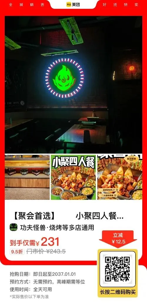周末聚餐不知道吃啥?🔥功夫怪兽·烧烤放大招,231元抢原价243元小聚四人餐~