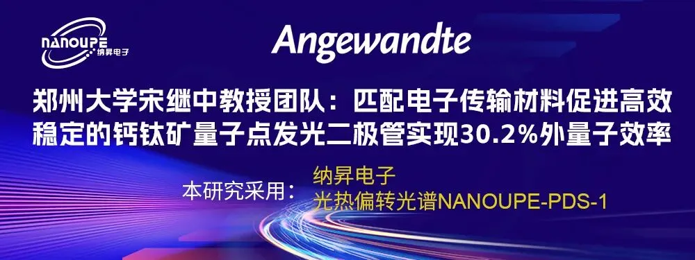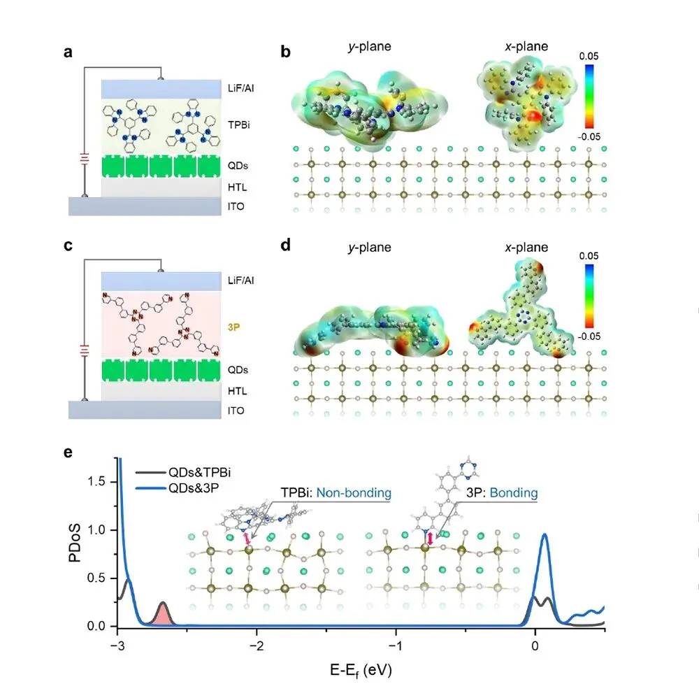 与常用的1,3,5-三(1-苯基-1H-苯并咪唑-2-基)苯(简称TPBi)相比,3P中的吡啶基团与钙钛矿之间存在强相互作用,这能有效抑制由量子点表面的Pb²⁺缺陷引起的界面非辐射复合。此外,3P具有深的最高占据分子轨道(HOMO),增强了空穴阻挡特性,同时也具备匹配的最低未占分子轨道(LUMO)和优异的电子迁移率,提升了电子传输性能,从而实现了载流子平衡并最大化了激子的复合效率。此外,3P的高热稳定性显著改善了量子点在温度变化、连续紫外照射和电场激发下的稳定性。
