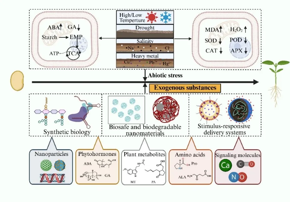 该研究系统评估了外源性物质(纳米材料、植物激素、代谢物、氨基酸、信号分子)在缓解胁迫、恢复萌发中的作用及其分子机制。研究发现外源性生物刺激剂通过调节ROS、激素与能量代谢,可显著提升种子在非生物胁迫下的萌发与活力。同时外源性物质的效果受浓度、作物种类及胁迫类型等多因素影响,且在复杂田间环境中的应用仍面临成本和环境安全等挑战。