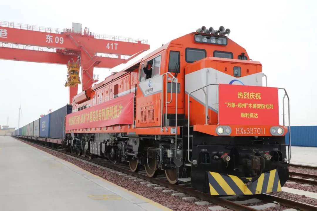 揭牌仪式开始前,上午10点来自东盟的木薯淀粉班列驶入郑州国际陆港东作业区站台,该趟国际班列合计35组,货重约950吨,从老挝万象站发出,经磨憨入境历时5天到达郑州。至此,郑州国际陆港木薯淀粉累计入库货量已达2万余吨,交易货量1.6万余吨,覆盖客户近80家,实现了木薯淀粉产业稳步启动。