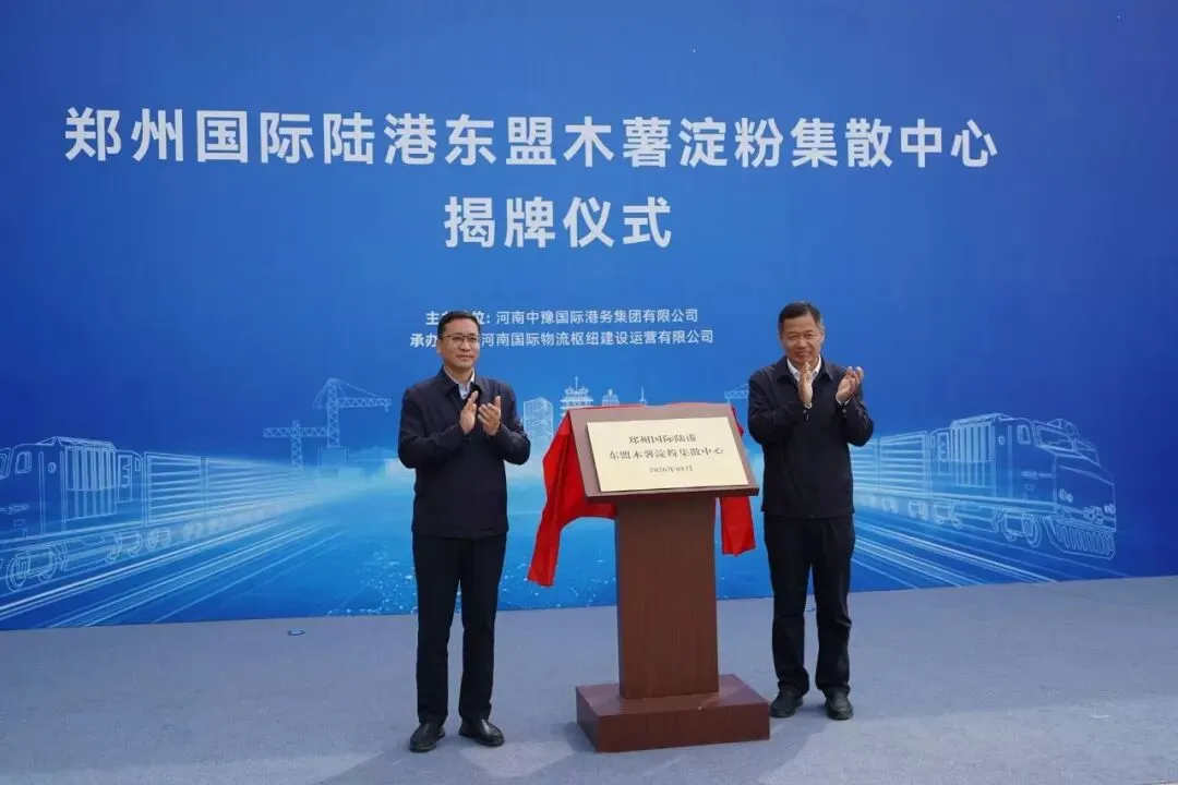 随后,李海峰、周彤共同为郑州国际陆港东盟木薯淀粉集散中心揭牌。